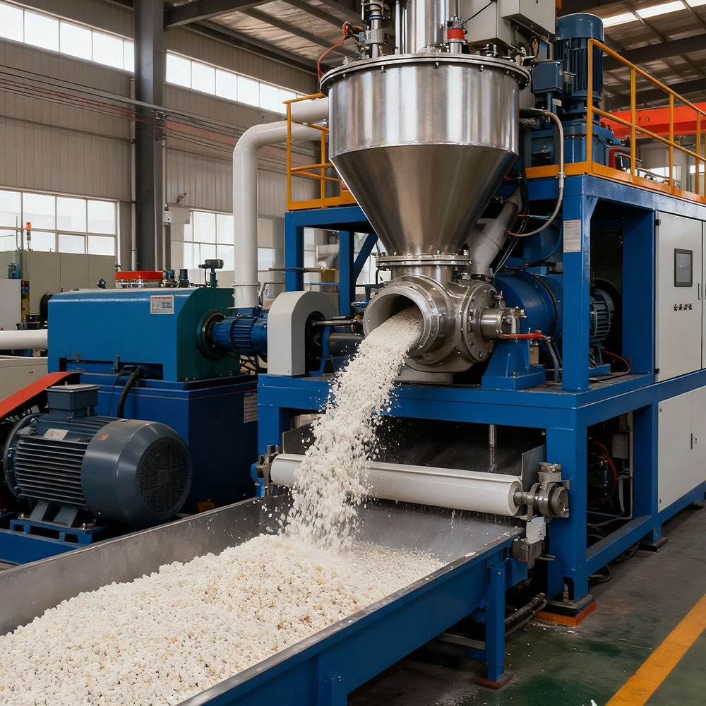 Hot Mixing: Add prepared raw materials to a high-speed hot mixer, mix at 100-120℃ for 5-10 minutes. Friction heat enables PVC resin to absorb liquid additives, forming uniform premix
