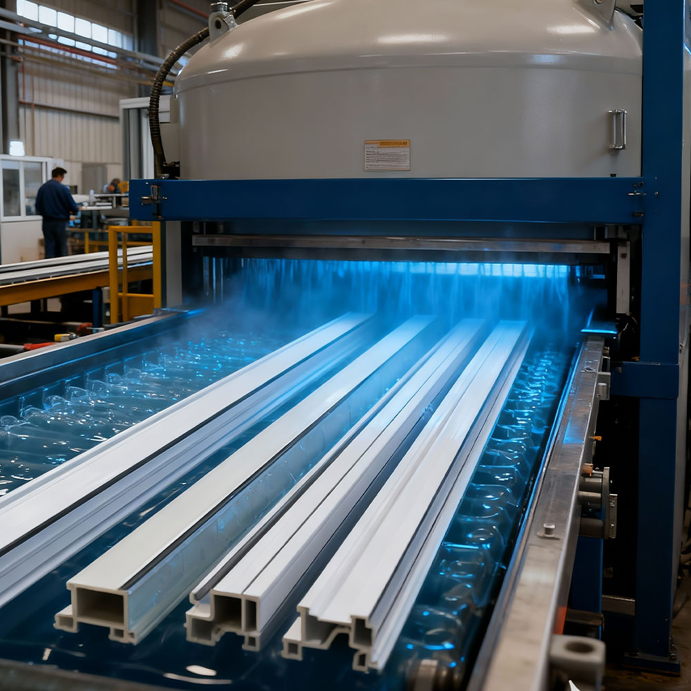 Vacuum Calibration: Profiles pass through precisely dimensioned calibration molds, tightly adhering to the mold cavity under vacuum adsorption, obtaining accurate dimensions and surface finish